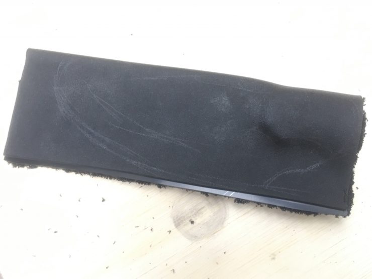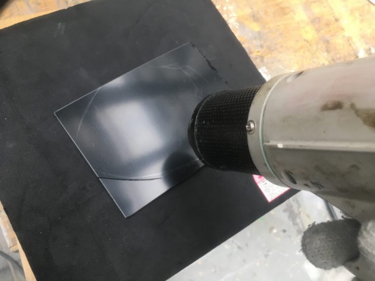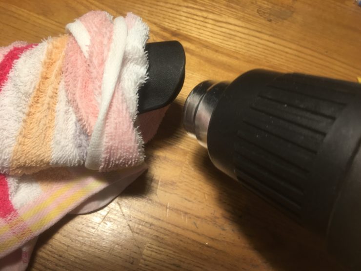 ヒートガンで温めて布ぐらいまで柔らかくします。 その後一気にスポンジでプレスします。