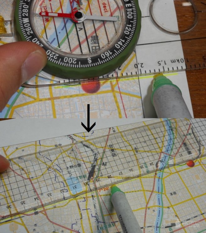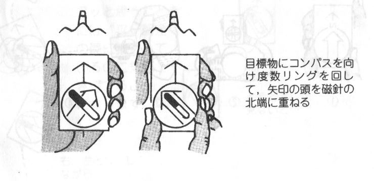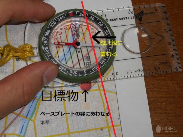 ④地図上の磁北線とカプセルの矢印(又はその平行線)を重ねあわせます。(この時、針は無視)