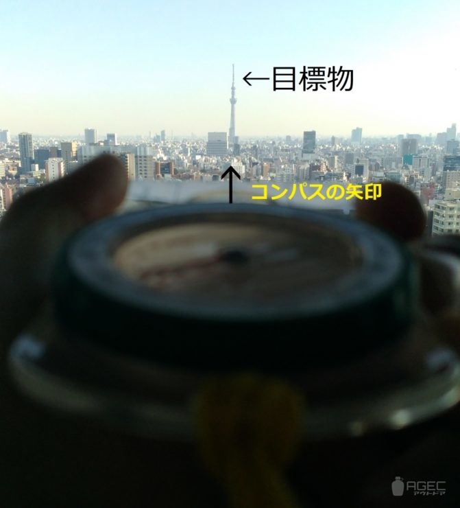 ①目標物を探します。目視できて、かつ地図上での位置がわかる地物を選びます。