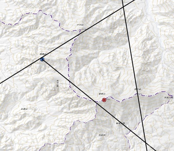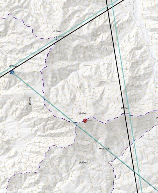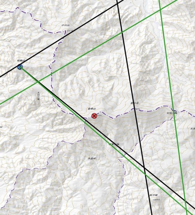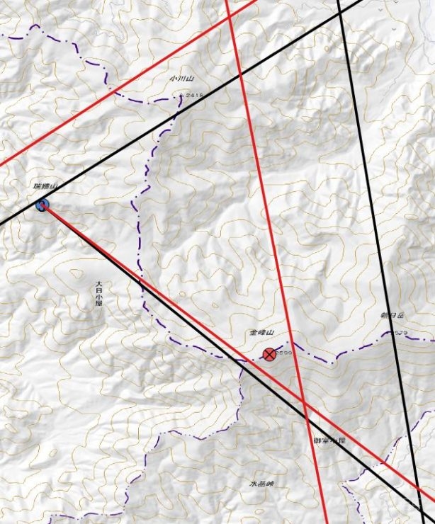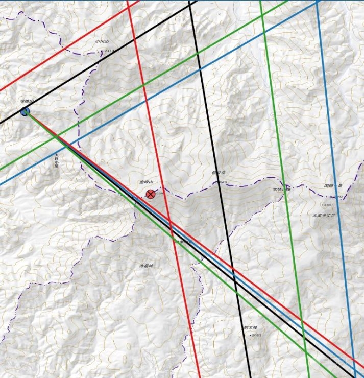 目標点②:北岳(N35°40′28″, E138°14′20″目標点③:瑞牆山(N35°53′36″, E138°35′31″)