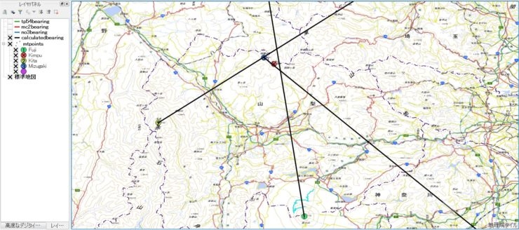 計測基点(金峰山山頂)から見たときの各目標地点の方位角の理論値です。国土地理院の高精度計算サイトで計算したものです。(今回使用する測地系はJGD2000なので楕円体はGRS80を選択して計算)