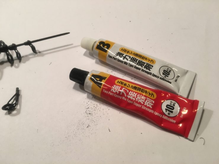 エポキシ接着剤で固定します。私は百均透明タイプを使用していますが、エポキシ系なら強いのかと思います。