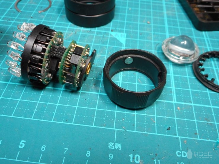 セレクターリングの内側に磁石が埋め込まれています。また、基盤に磁気センサーが並んでいます(写真で一番右の基盤の手前側に並んでるチップです)。