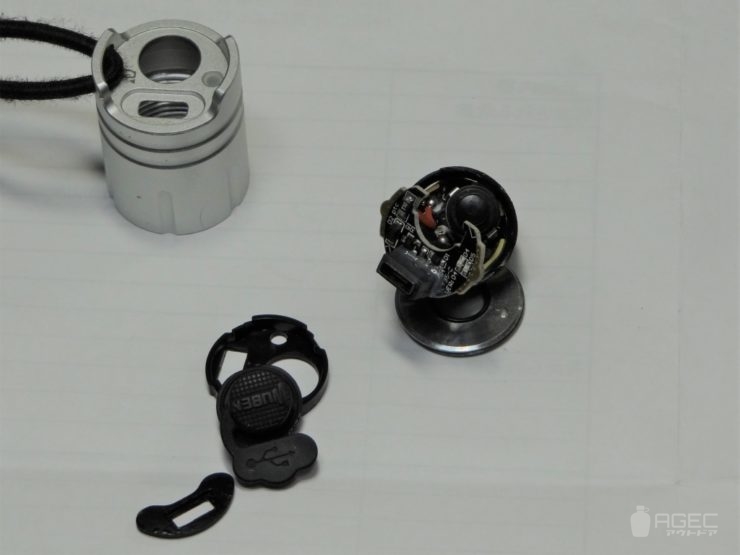 スむッチは基板が2局構造。USBからの入力はスむッチず䞊列に接続されおいたす。ヘッド偎で入電を感知しお極端子をボディに接続するのでしょう。