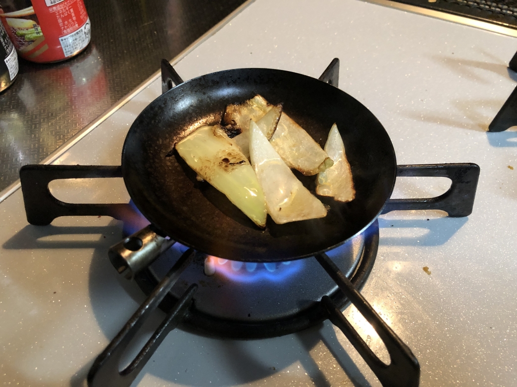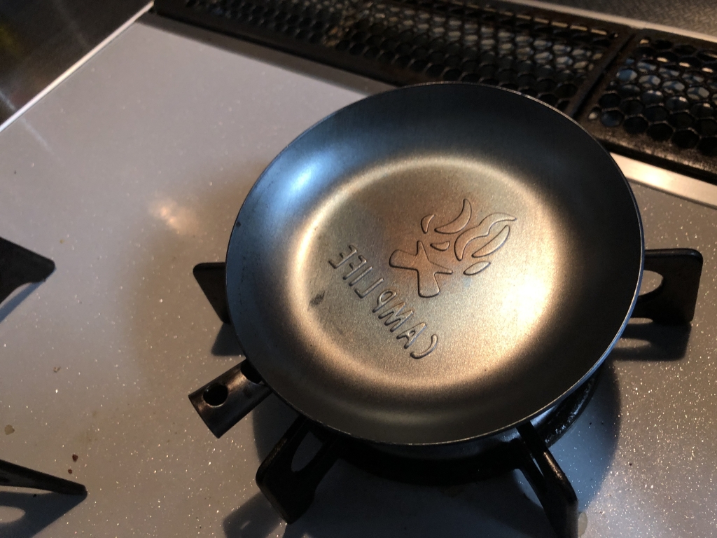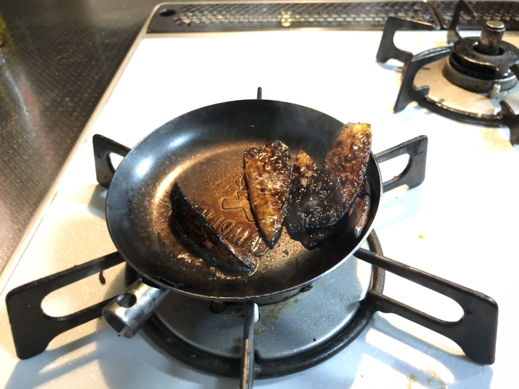 まず表面の防錆加工を焼き切っていきます。家庭のコンロですと鉄パンの温度が上がり切る前に自動で火力調整されてしまうことがありました。