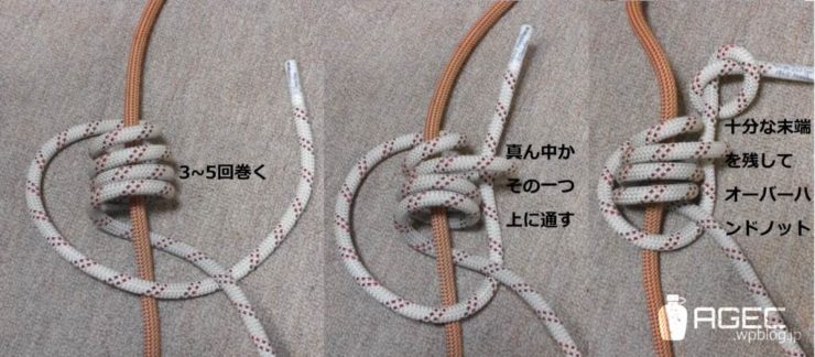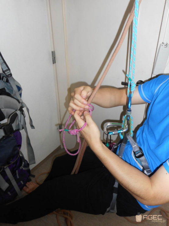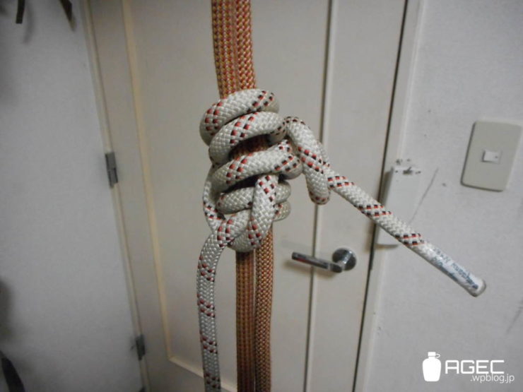 嘘です。こういうときは仕方ないのでぶらさがってるロープそのものを使うしかありません。ロープ末端でフリクションヒッチをやる方法があるので紹介します。ポロネって言う結び方です。ブレークスヒッチとも言います。ほかにも同じ機能の結びでバルトタンっていうのもあるんですけど、筆者はまだ覚えてません(反省)。