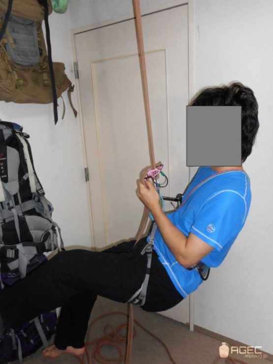 まず、注意点はセットの向き間違えたら止まりません。また、これはやってみればすぐわかりますが、ビレイ器の中をロープが屈曲してセットされているので、ロープ登高で使うアッセンダー要素2つのうちの下側にしかセットできません。