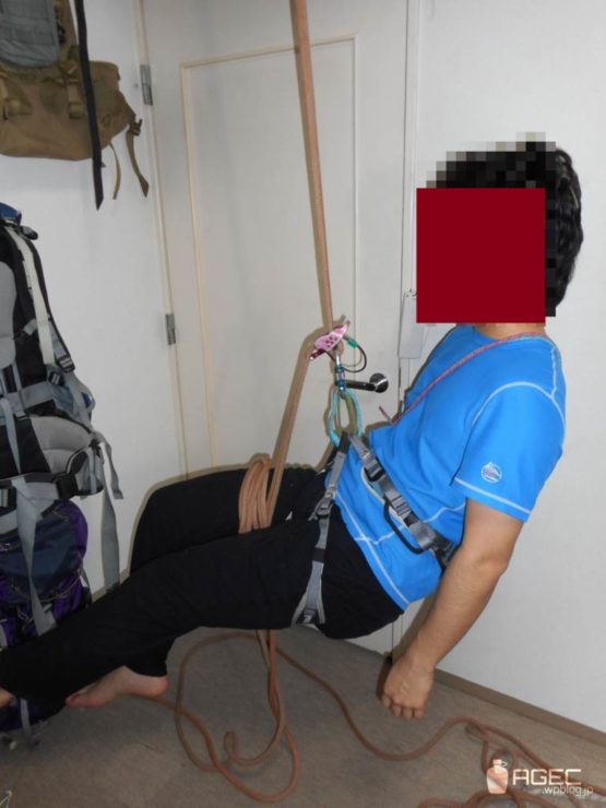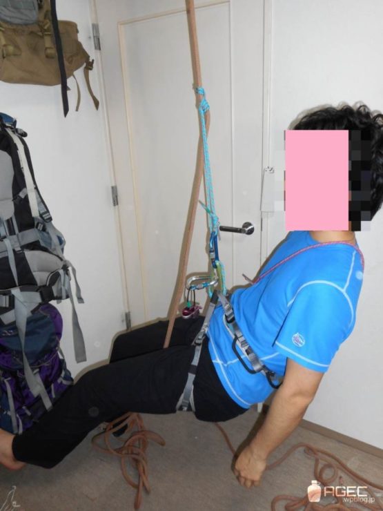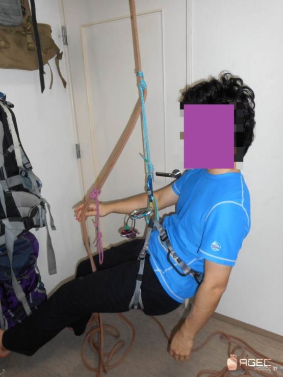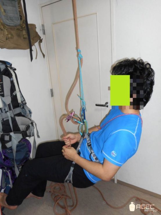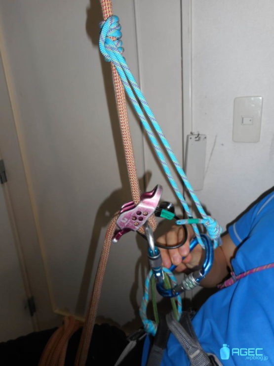 などの下降器が動かせない場合や他にもロープ上の結び目など固定されていて動かせないものにぶら下がっている場合は別の方法を使う必要があります。そういう場合は、いろんなやり方がありますが、これが一番簡単です↓。