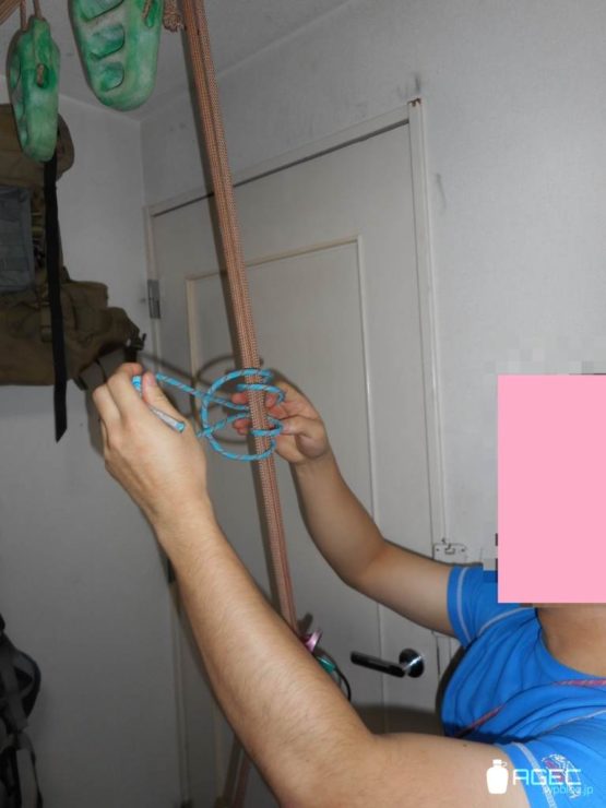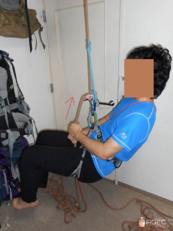 フリクションヒッチの結び目部分を掴んで体重をかけると落ちます。登ってる時は特に要注意。