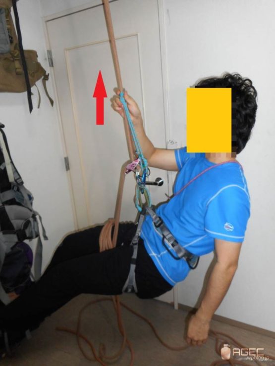 登り返すためには下降器にぶら下がっている状態からフリクションヒッチにぶら下がっている状態にしなきゃいけません。どうする?