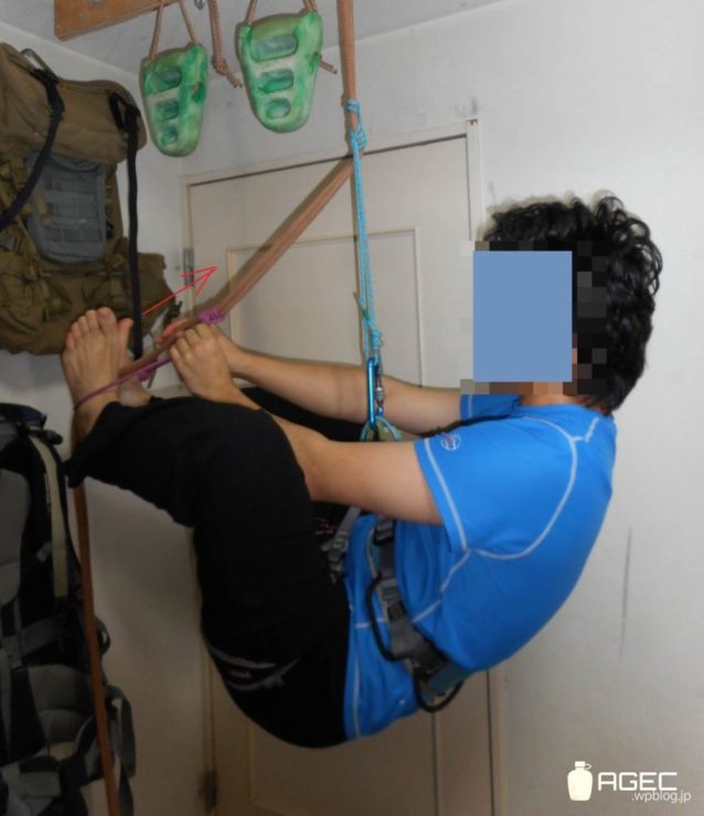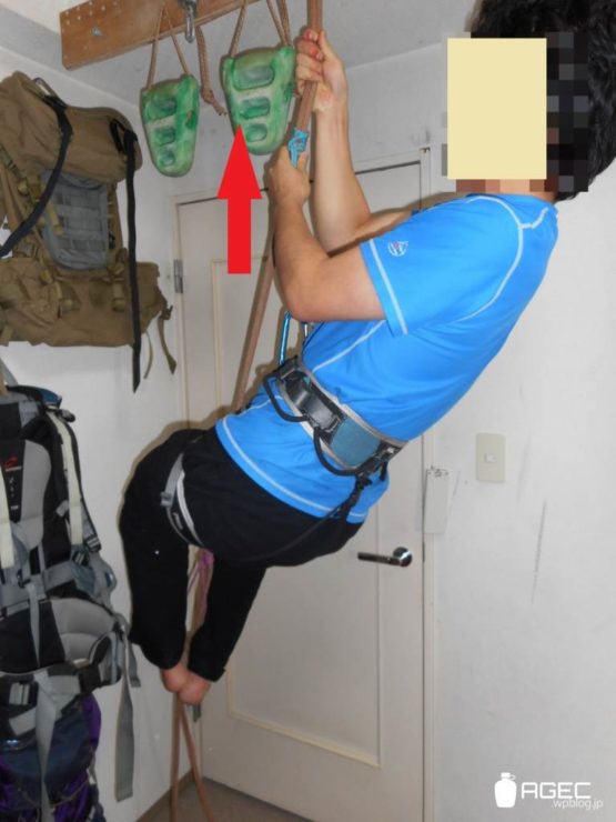 そのスリングが効くことを確かめたら上の方にずらして足を突っ込みます。下のスリングに立ち上がると同時に上のスリングをさらに上にずらします。ずらしたらまた上のスリングにぶら下がります。