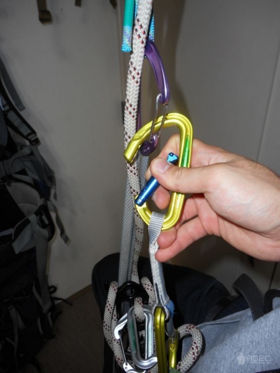 ロープ2本の場合は写真のように足にスリングでセットすることを勧めます。ビレイループ側でもできなくはないですが、ロープ径によっては非常にやりにくいです。これも実際にやってみればすぐわかることです。