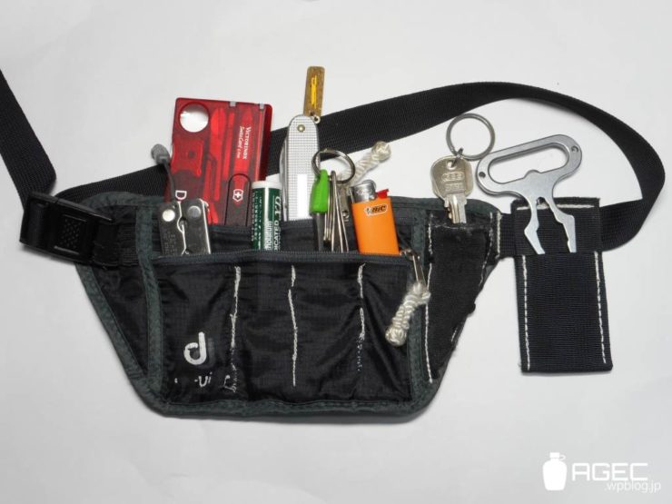 筆者は小物のEDCには薄いウエストポーチを使ってます。過去の経験上、ズボンやベルトでのEDCはズボンをはき替える時の移し替えがめんどくて携帯率が下がってしまうからです。めんどいとやっぱり今日だけ別にいいやってなっちゃうんですよね。ウエストポーチなら家を出る時にサッとつけるだけです。それに身に着けているときもTシャツの下に隠れるので外から見てもわかりません。それに位置的にも触られたりしにくい場所ですし。