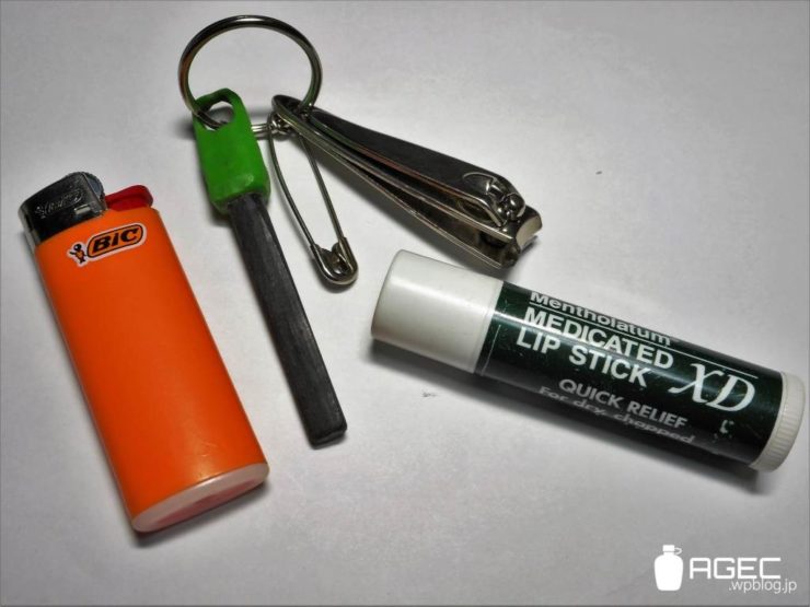 爪切り、安全ピン、ファイヤースチール、リップ、ミニビック。爪切りと安全ピンは結構使うので出しやすい位置にあります。ファイヤースチールは緊急時用ってとこです。ライトマイファイヤーのハンドルを削ってダイエットしたものです。喫煙者じゃないのでライターの使用頻度は低く、ミニビックは出しにくい奥に入れてます。なんでビックか?そりゃあチャイルドレジスタンス機能を解除できるからですよ~。