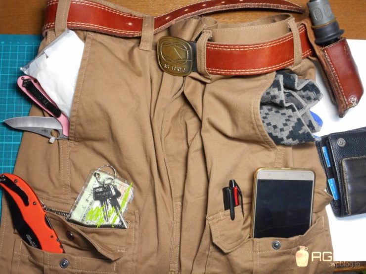 ナイフもスイスカードと並んで使用頻度高いんじゃないでしょうか?ナイフは3インチクラスと3.5~4インチクラスのフォルダーを1本ずつ、計2本を携帯していることが多いです。小さい方は使用頻度が高いので右前のポケットに挿してることが多いですが、大きい方は右のカーゴポケットに挿してます。カーゴポケットってフラップがあるので引っかかりにくいんですよね。ナイフはその日の気分で引き出しからテキトーに選んでます。日によっては大きい方1本だけのこともあります。冬場だと左脇にフィクストを吊ってることもたま~にあります。これはチノパンを履いてるときが多いです。あ、一応言っときますけど正当な理由が無い時は刃物を携帯しちゃいけません!