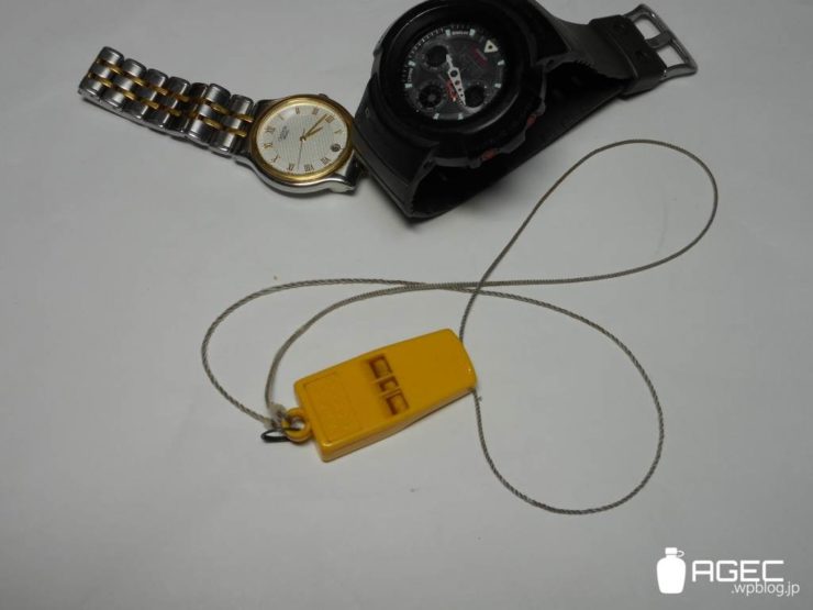 腕時計は3つくらい持ってましてその日の気分でどれつけるか決めてます。笛は風呂に入るとき以外は常時首から下がってます。このタイプは軽くて小さくて音も大きく、プラなので寒い日に皮膚にふれても冷たくないです。紐はパラコードのストランド1本です。引っ掛け事故防止のためにスプリットリングを改造したものをつけて強い負荷で破断するようにしてます。