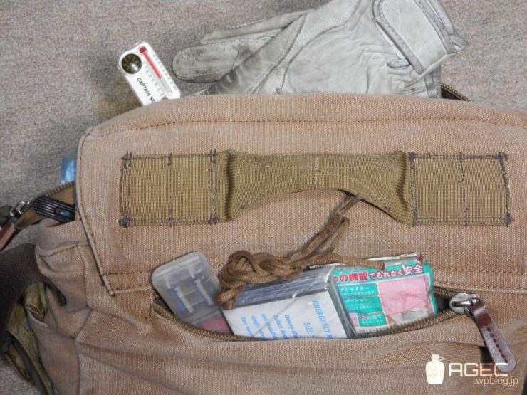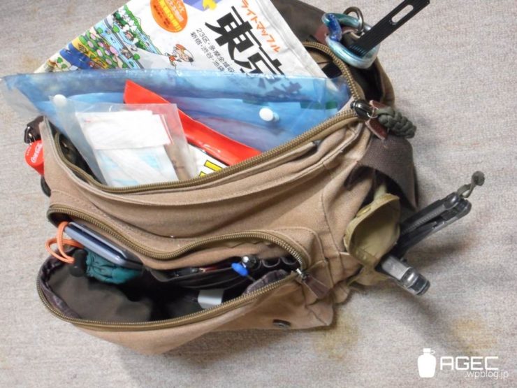 EDC支援とでも言うべきでしょうか?緊急時対応系の多くはカバンに入ってるものが多いです。ザックだとライディングジャケットに引っかかってめんどいのでアマゾンで買ったやっすいメッセンジャーバッグを使ってます。ハンドルとかクロスストラップとか縫い付けたりしてます。